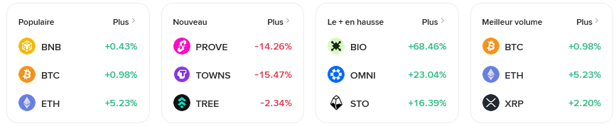 Plus de 540 paires crypto-crypto sont disponibles. Binance prend en charge à la fois les cryptos majeures (Bitcoin, Ethereum, BNB…) et de nombreux tokens à faible capitalisation.